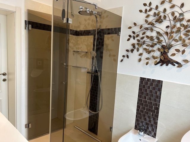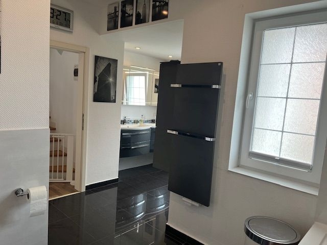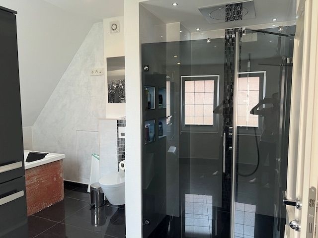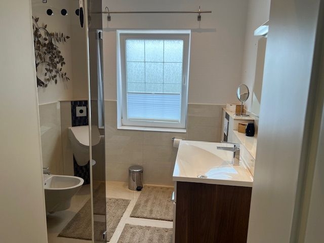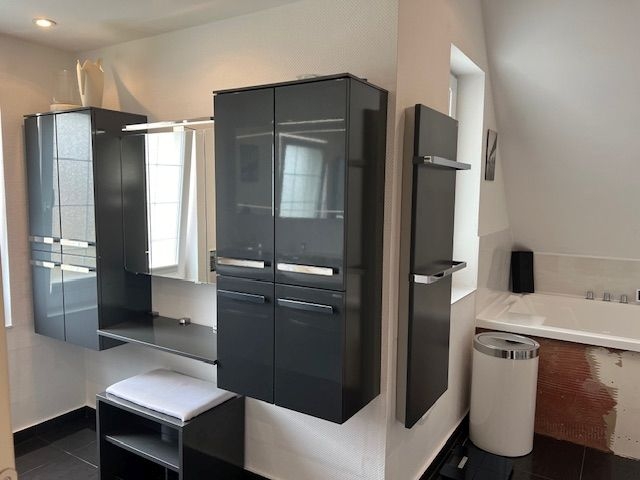 - Bad OG (neu in 2013) mit Fenster: WC, 2 HWB, Whirlpool-Badewanne, ebenerdige Dusche mit Glastür, Fliesen in weiss, verschiedene Höhen gefliest, Bodenfliesen in anthrazit, Handtuchheizkörper, Schminkecke