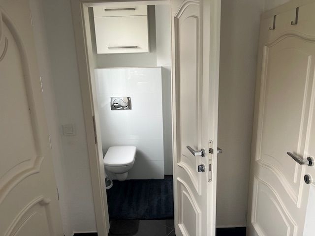 - Bad EG (neu in 2013) mit Fenster: WC, HWB, Pissoir, Bidet, Dusche mit Duschwand, Handtuchheizkörper vorbereitet, Fliesen in beige, verschiedene Höhen gefliest