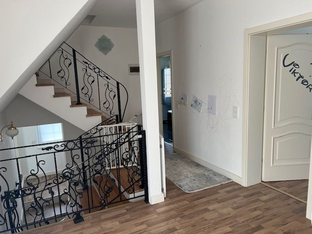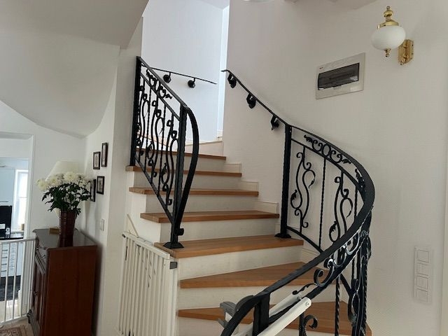 - Treppe: Holztreppe (Stufen aus Eiche) mit Stahlhandlauf und -deckspindeln
