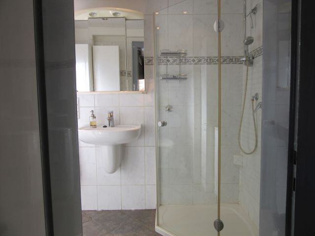 - Bad EG mit Fenster: HWB, WC, Dusche mit Duschwand (flacher Einstieg), 2m hoch gefliest (Fliesen in weiss/geflammt mit Bordüre), Handtuchheizkörper