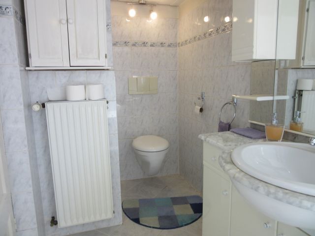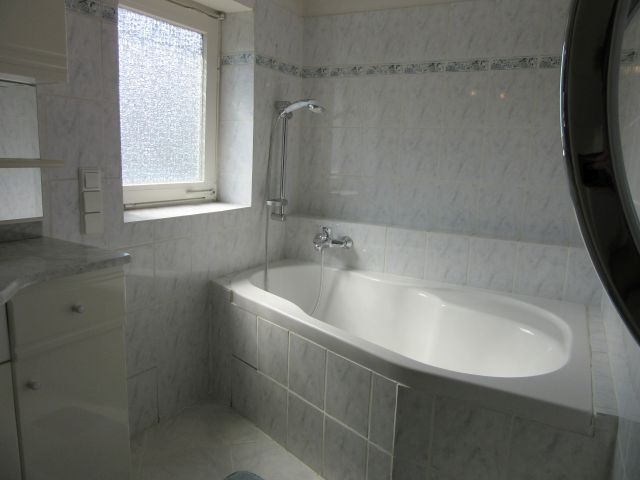 - Bad DG mit Fenster: Waschtisch mit Unterschrank, WC, Eckbadewanne, 2m hoch gefliest (Fliesen in hellgrau/geflammt mit Bordüre), Badezimmermöbel