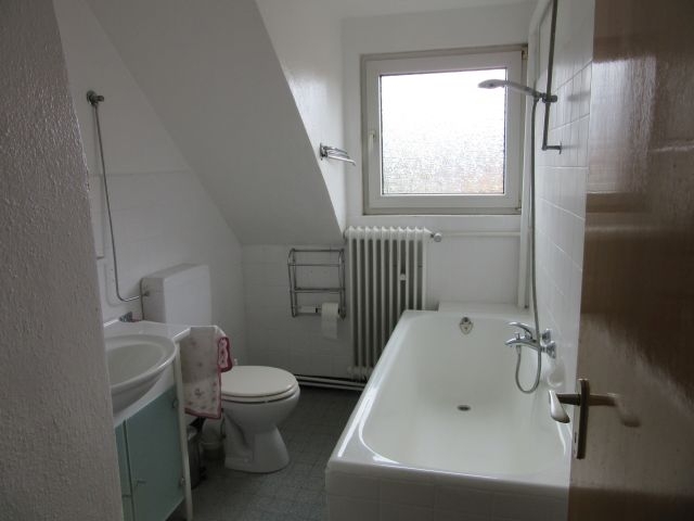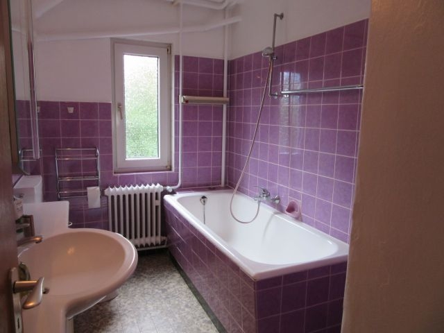- Bad OG mit Fenster: WC, HWB, Badewanne, Fliesen, verschiedene Höhen gefliest (weiss gestrichen)
