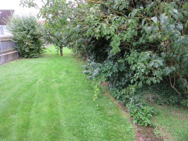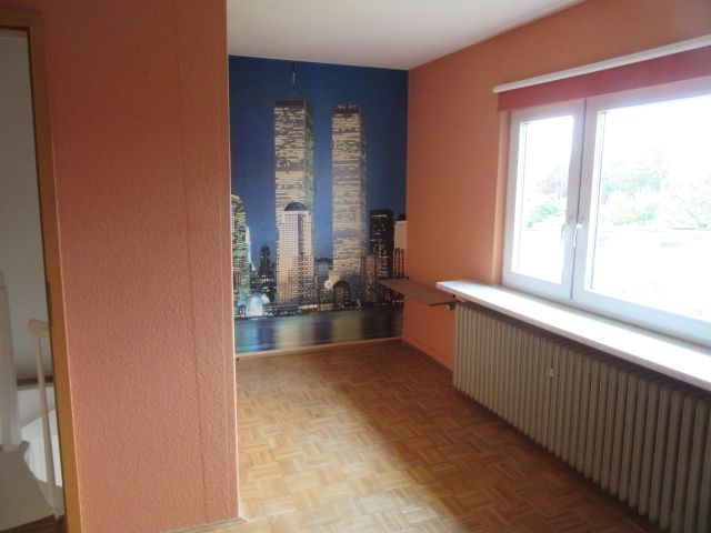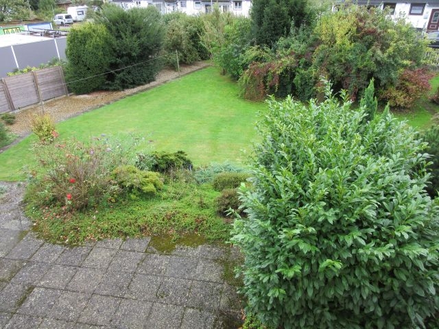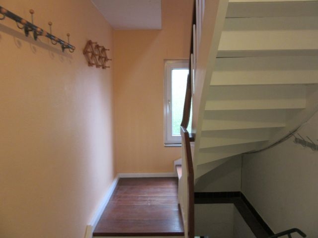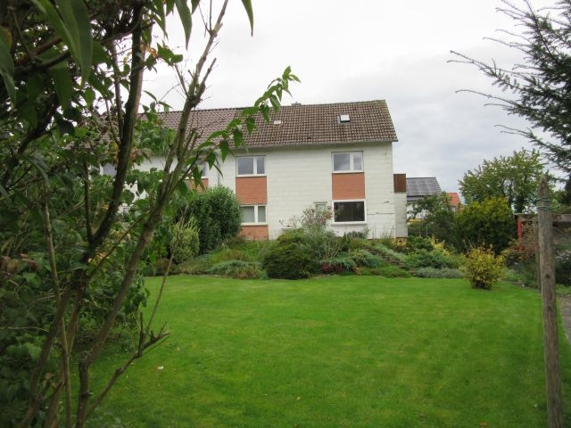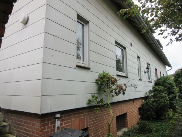 DHH (massiv gebaut), Bj. 1962, Vollkeller (65 qm), Eigentumsgrundstück, Außenmauerwerk mit Plattenbehang (hellgrau und rot), Satteldach, Dacheindeckung: Ziegel (dunkelrot), pflegeleicht angelegter Garten. Der Keller ist massiv gebaut, der obere Teil des Gebäudes ist ein Massivkernbau (Fachwerkgerüst mit darauf genagelten dämmenden Platten, Hohlräume mit Füllung= Bimskies und weiterem Isoliermatarial). Folgende Raumaufteilung ist vorhanden: EG= Flur, Küche, Wohnzimmer, Eßzimmer, Gäste-Zimmer, Bad, DG= Flur, Schlafzimmer, 2 Kinderzimmer, Büro, Bad, KG= Flur mit Außenaufgang, Heizungs-/Waschkeller, Werkraum, Vorratsraum, weiterer Kellerraum.