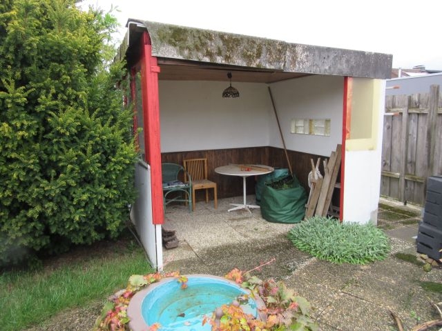 DHH (massiv gebaut), Bj. 1962, Vollkeller (65 qm), Eigentumsgrundstück, Außenmauerwerk mit Plattenbehang (hellgrau und rot), Satteldach, Dacheindeckung: Ziegel (dunkelrot), pflegeleicht angelegter Garten.