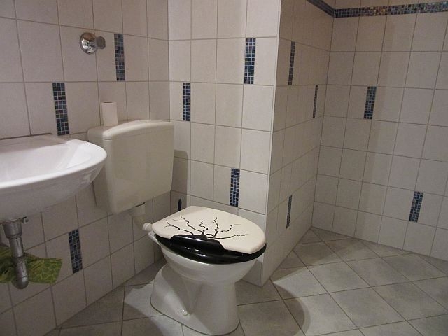 - Gäste-WC: WC, HWB, Fliesen in weiss mit Bordüre und Mosaik (blau), 1,70 m hoch gefliest
