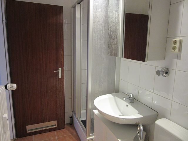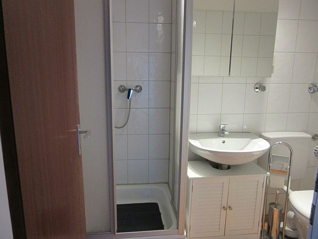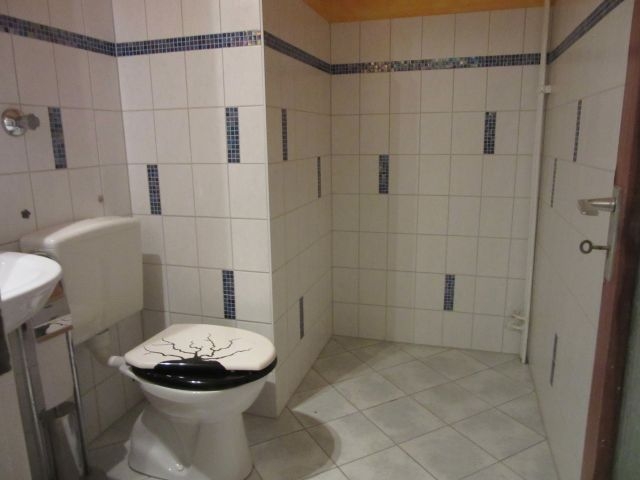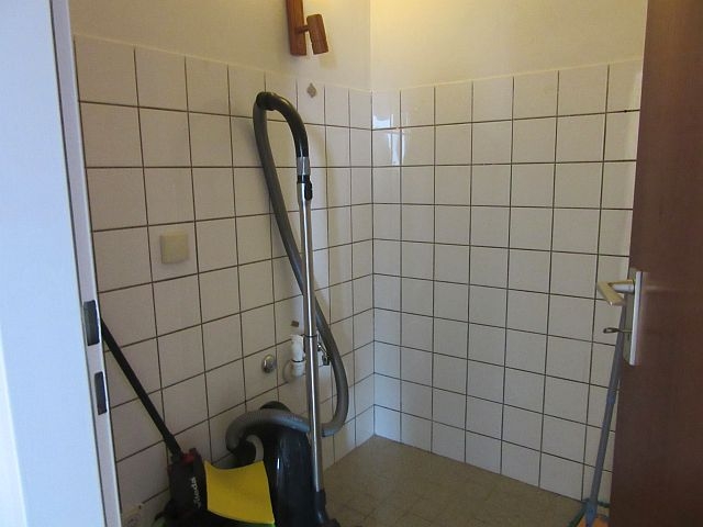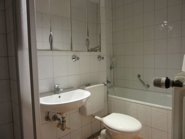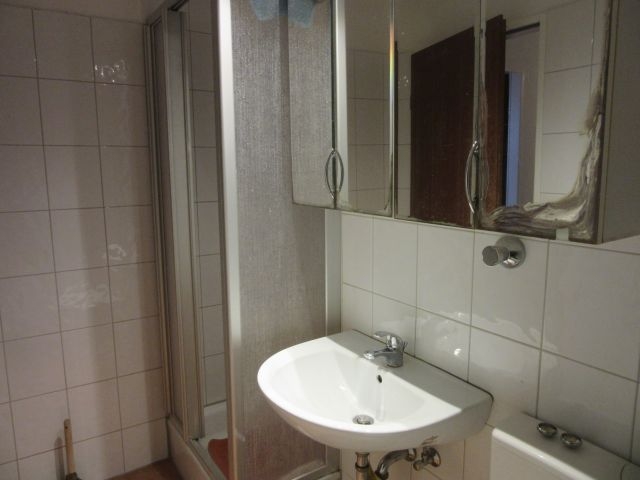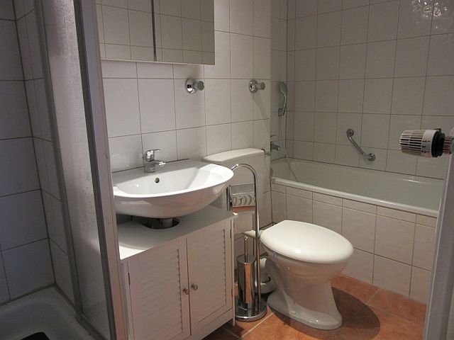 - Badezimmer: Badewanne, Dusche mit Duschwand, WC, HWB, Wandfliesen in weiss, verschiedene Höhen gefliest