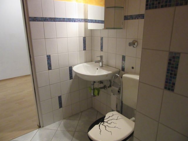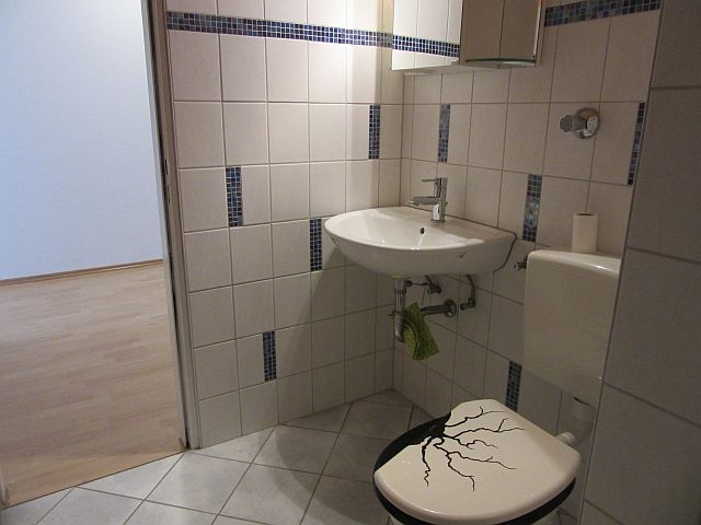 Die ideal geschnittene Eigentumswohnung ist, wie folgt, ausgestattet: - Kunststofffenster mit Isolierverglasung (innen weiss, außen grün) - Fensterbänke innen: Kunststein, Fensterbänke aussen: Stahlbleche - Platten- und Rippenheizkörper - Fußböden: Laminat, Fliesen - Türen: Stahlzargen (weiss gestrichen) und Türblätter aus Holz (mahagoni) - Badezimmer: Badewanne, Dusche mit Duschwand, WC, HWB, Wandfliesen in weiss, verschiedene Höhen gefliest - Gäste-WC: WC, HWB, Fliesen in weiss mit Bordüre und Mosaik (blau), 1,70 m hoch gefliest