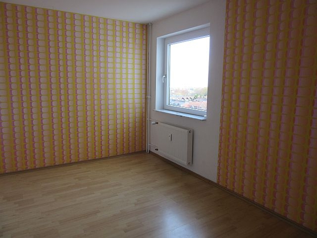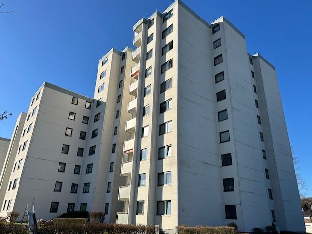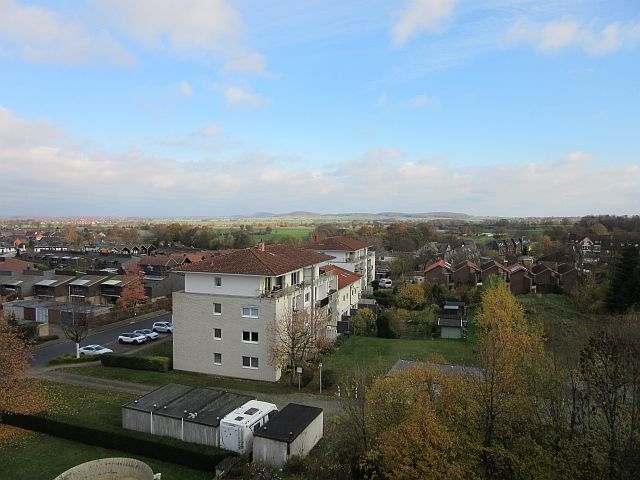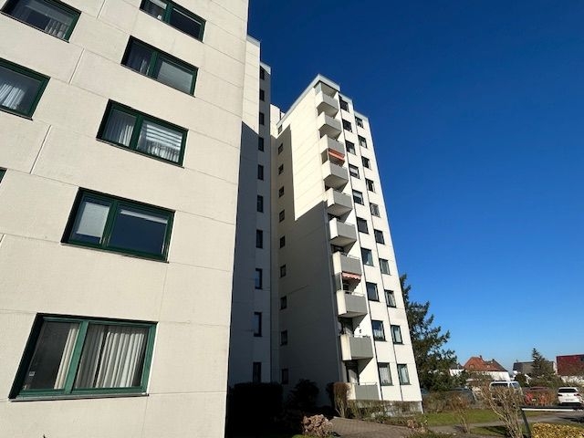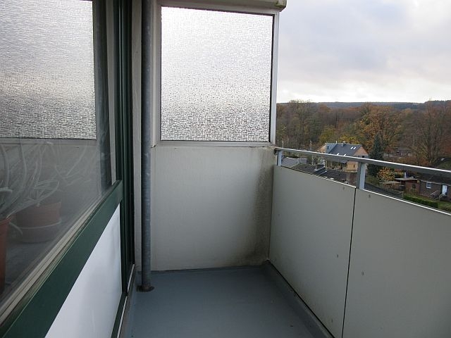 Helle 4-Zimmer-Wohnung mit tollem Blick, 5. Etage, 10 geschossiges Wohnhaus mit 82 WE (verteilt auf 2 Eingänge), Bj. 1972, Fahrstuhl, Treppenhaus (gepflegt), offene Konstruktion, Laufbalken aus Beton mit Kunststeinstufen. Außen: Kalksandsteinmauerwerk mit weißen Platten verkleidet, Flachdach.