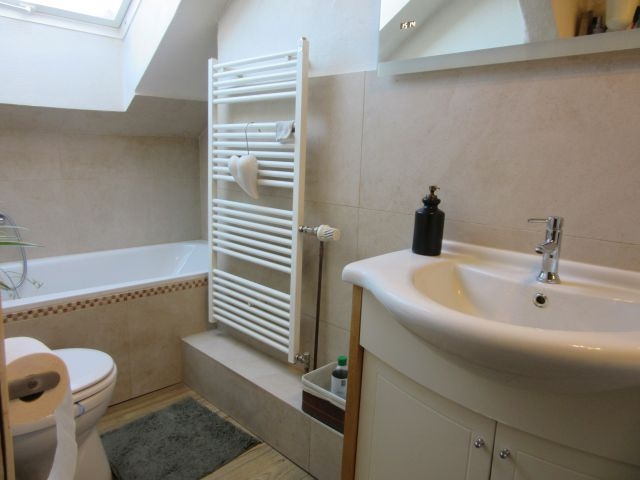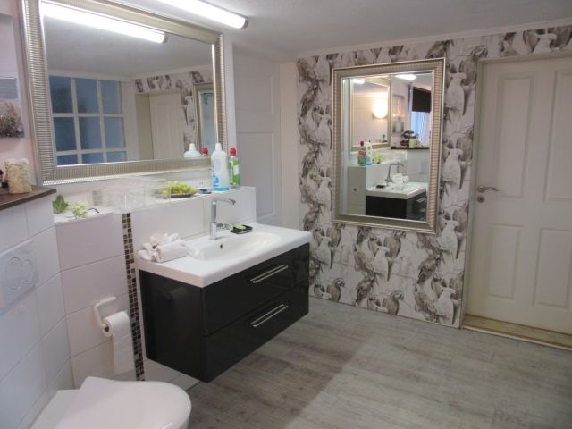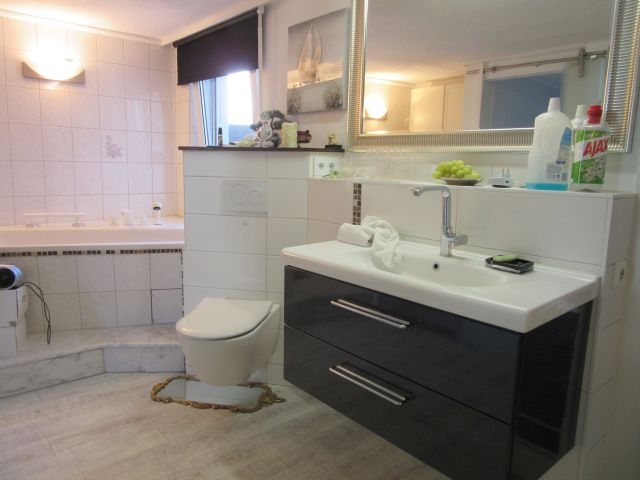 - Bad 1 (EG, neu in 2015) mit Fenster: WC, Waschtisch mit Unterschrank, Eckbadewanne, verschiedene Höhen gefliest (Fliesen in weiss mit Muster)