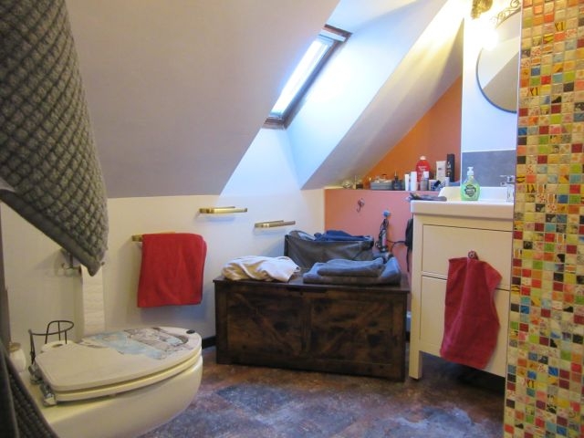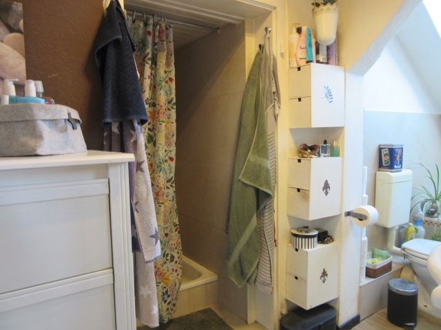 - Bad 4 (DG, neu in 2020) mit Fenster: WC, HWB, Dusche, verschiedene Höhen gefliest (Fliesen in verschiedenen Farben, tlw. Mosaik), eingemauertes Regal