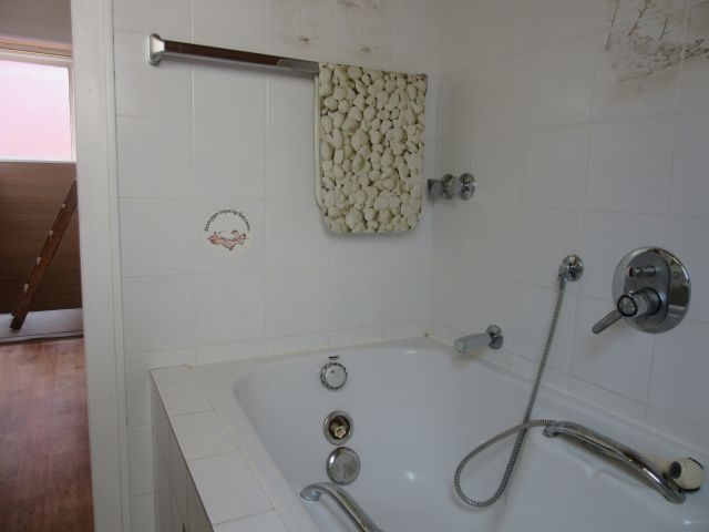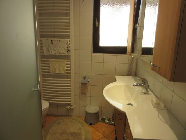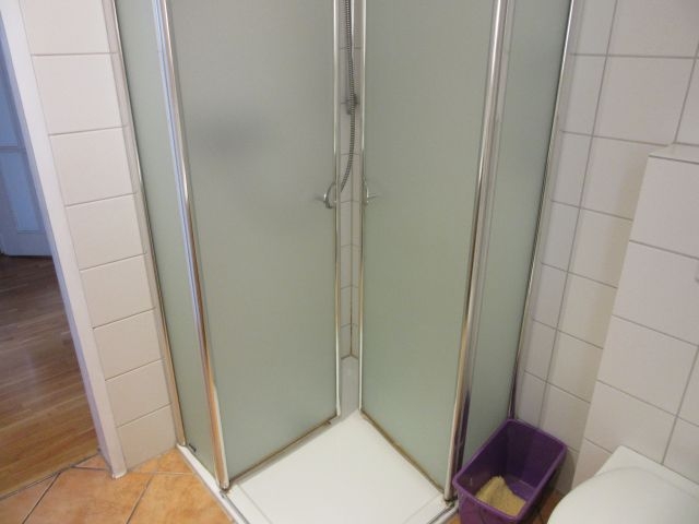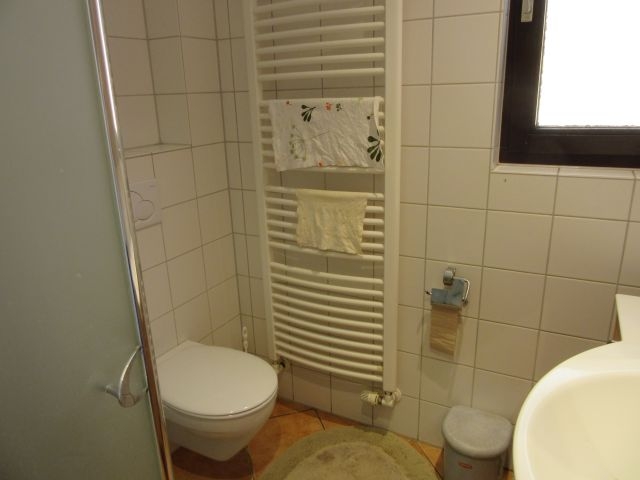 - Bad EG (neu in 2004) mit Fenster: Dusche mit Duschwand, HWB, WC, 2m hoch gefliest, Fliesen in weiss, Bodenfliesen in terracotta
