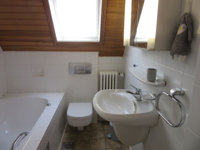 - Bad DG mit Fenster: Badewanne, HWB, WC, deckenhoch gefliest, Fliesen in weiss
