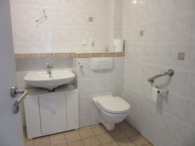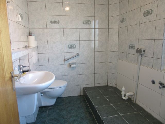 - Bad EL-WHG mit Fenster: WC, HWB, Dusche möglich, Fliesen in weiss (geflammt), tlw. mit Ornamenten, deckenhoch gefliest