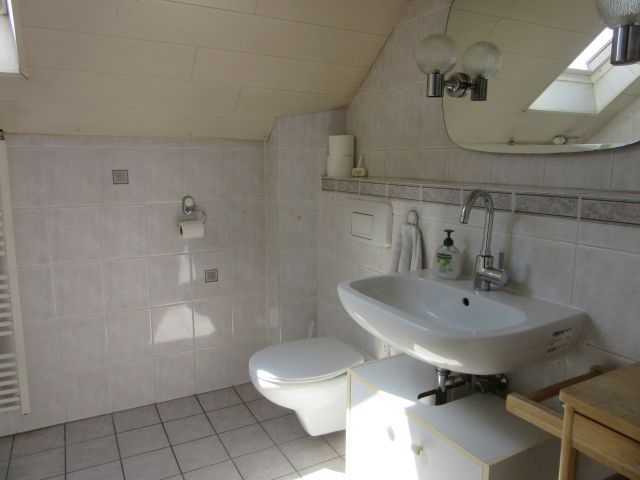 - Bad DG mit Fenster: WC, HWB, Dusche mit Duschwand, Fliesen in weiß, deckenhoch gefliest, Handtuchheizkörper