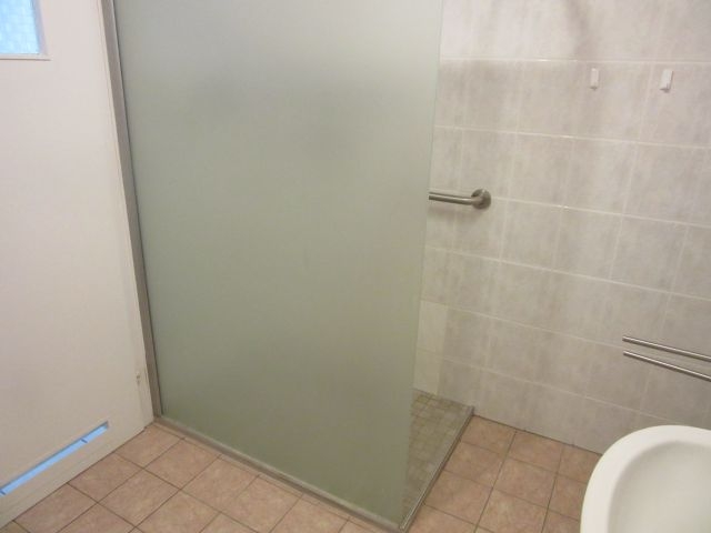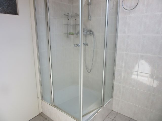 - Bad EG (neu in 2000): WC, HWB, ebenerdige Dusche mit Glaswand, Fliesen in weiß (gesprenkelt) mit Bordüre, deckenhoch gefliest, Handtuchheizkörper