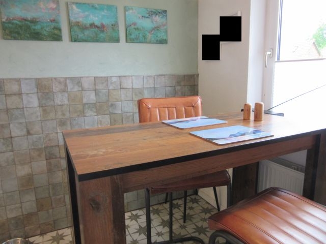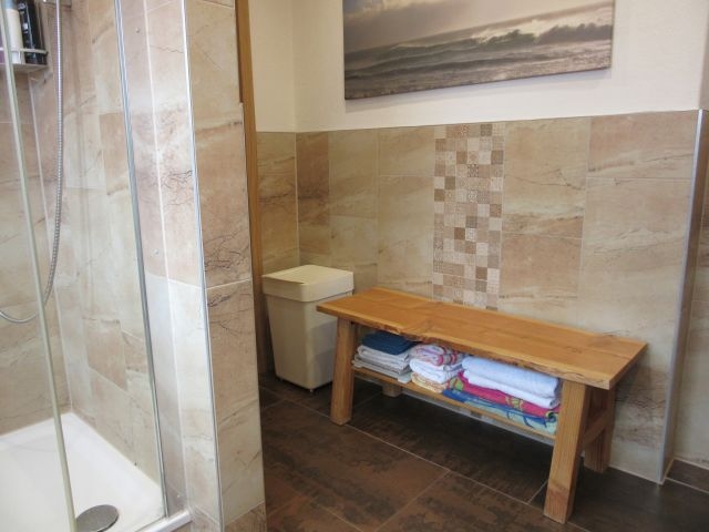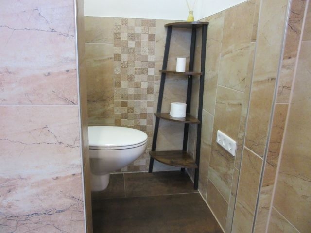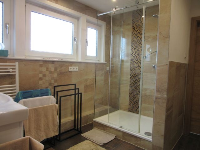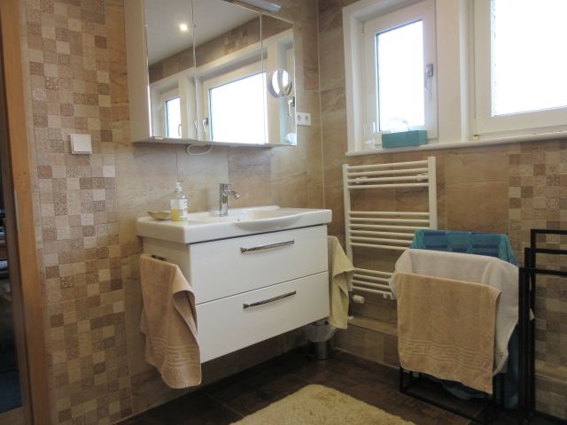 - Bad mit Fenster (Komplettsanierung in 2020): WC, große Dusche mit Duschwand (Glas), Fußbodenheizung, Waschtisch mit Unterschrank, verschiedene Höhen gefliest (sandfarben), Bodenfliesenplatten (braun), Handtuchheizkörper