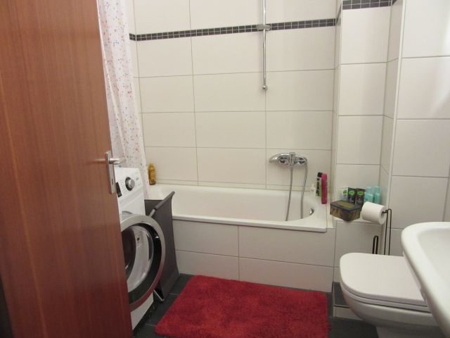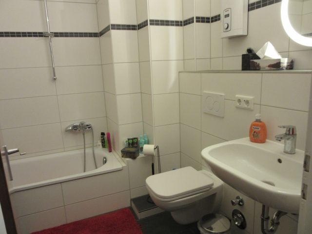 - Badezimmer (neu in 2018): WC, HWB, BW, verschiedene Höhen gefliest (Fliesen in weiss mit Bordüre), Bodenfliesen in anthrazit, WM-Anschluss