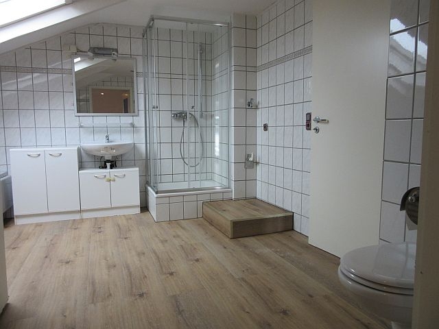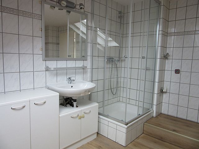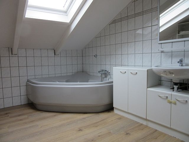 - Bad mit Fenster: Dusche mit Duschwand, Eckbadewanne, WC, HWB, Fliesen in weiss -geflammt- (deckenhoch gefliest), Handtuch-HK, WM-Anschluss