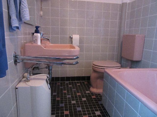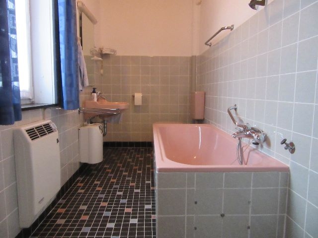 - Bad EG mit Fenster: WC, HWB, Badewanne, Fliesen in grau, 1,60m hoch gefliest, Durchlauferhitzer